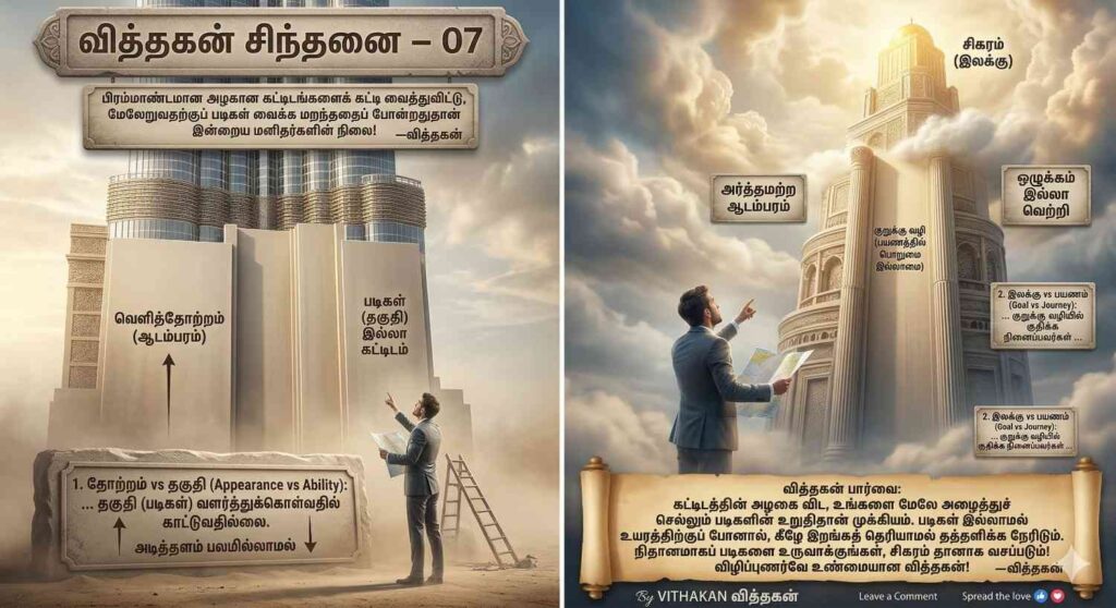 வித்தகன் பார்வை: கட்டிடத்தின் அழகை விட, உங்களை மேலே அழைத்துச் செல்லும் படிகளின் உறுதிதான் முக்கியம். படிகள் இல்லாமல் உயரத்திற்குப் போனால், கீழே இறங்கத் தெரியாமல் தத்தளிக்க நேரிடும். நிதானமாகப் படிகளை உருவாக்குங்கள், சிகரம் தானாக வசப்படும்! விழிப்புணர்வே உண்மையான வித்தகன்!